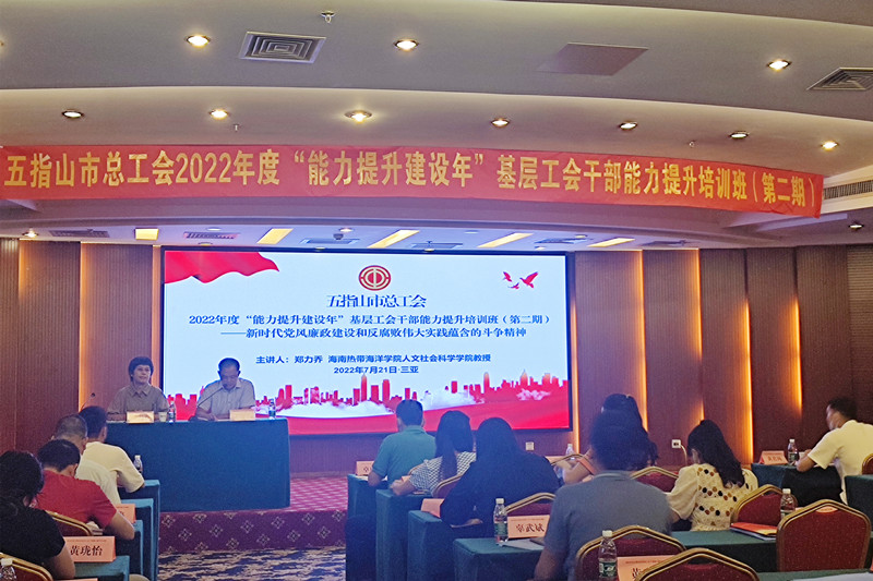 7月21日下午,人文社会科学学院党委书记郑力乔应邀为五指山市总工会“能力提升建设年”基层工会干部能力提升培训班(第二期)作题为“新时代党风廉政建设和反腐败伟大实践蕴含的斗争精神”的辅导讲座,本次培训以“理论+案例”的形式开展,五指山市总工会基层干部53人参加。