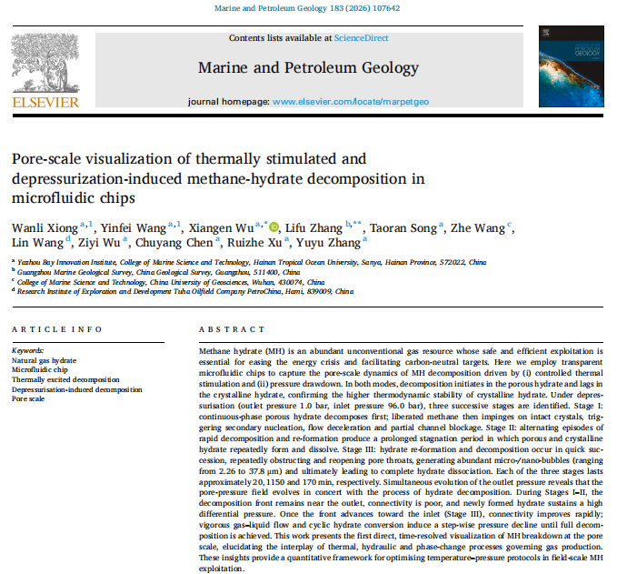 近日,我院海洋科学专业22级本科生熊婉利同学及小组成员张彧淯、吴子逸、陈楚洋和许睿哲同学在国际期刊Marineand Petroleum Geology(中国科学院二区)上发表题为Pore-scale visualization of thermally stimulated and depressurization-induced methane-hydrate decomposition in microfluidic chips的研究论文。该成果标志着beat365本科生科研能力达到国际高水平,为海洋科学领域人才培养写下亮眼注脚。