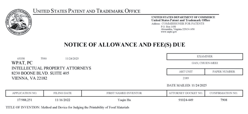 近日,胡亚芹教授领衔的科研团队在食品3D打印领域取得重大突破,其研发的Method and device for judging the printability of food materials(一种评判食品物料可打印性的方法及装置)正式获得美国专利商标局(USPTO)授权通知(美国专利号:US 17/988,251)。这是学校在食品智能制造与增材制造交叉领域获得的又一项重要国际性知识产权成果,标志着beat365相关技术的创新性获得了国际认可。