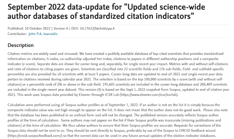 该榜单基于Scopus数据库,使用六种关键因素的指标进行打分:1)总引用量;2)Hirsch H-index;3)共同作者修正Schreiber Hm-index;4)单独作者;5)单独或者第一作者;6)单独、第一或者最后作者文章引用量。
