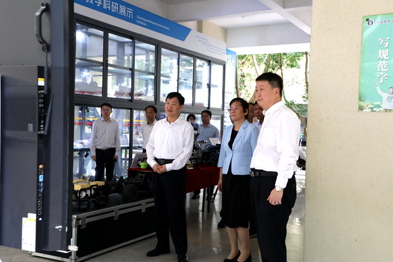 刘小明一行先后走进学校国家大学科技园、无人系统研究与应用中心和轮机模拟器实训中心,详细了解国家大学科技园建设情况和成果展示、无人系统研究与应用中心的科研、教学和育人情况以及轮机模拟器实训中心功能和教学应用情况。
