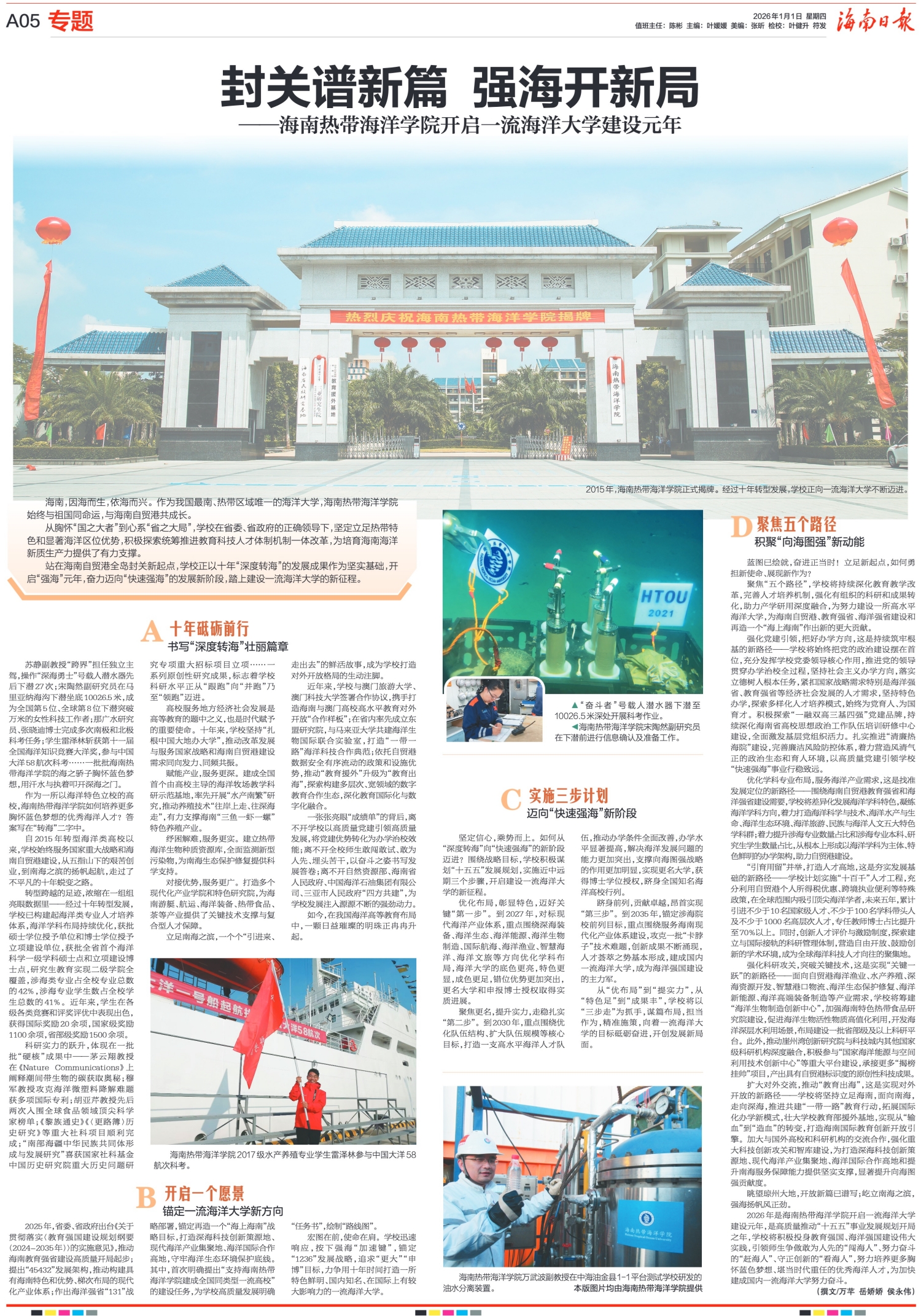自2015年转型海洋类高校以来,学校始终服务国家重大战略和海南自贸港建设,从五指山下的艰苦创业,到南海之滨的扬帆起航,走过了不平凡的十年蜕变之路。