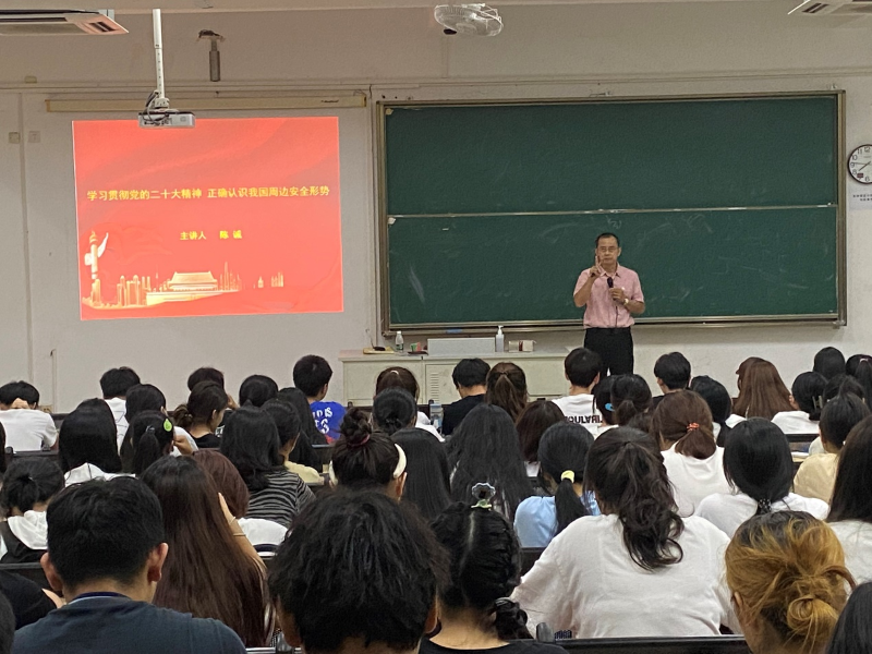 陈诚在宣讲时以“学习宣传贯彻党的二十大精神,正确认识我国周边安全形势”为题,围绕深刻领会党的二十大主要成果、党的二十大报告提出许多新的重要思想、重要观点、重大论断、重大举措等方面,对党的二十大精神进行了宣讲解读;对我国周边环境的基本情况、周边环境安全问题及对我国带来的巨大影响等进行系统讲解,宣讲报告内容丰富,案例生动、典型,帮助广大师生进一步深化了对党的二十大精神的理解和把握,深刻领会“两个确立”的决定性意义。