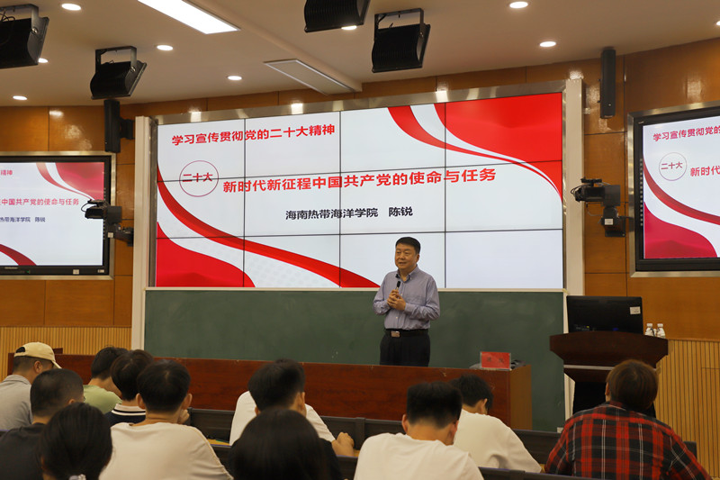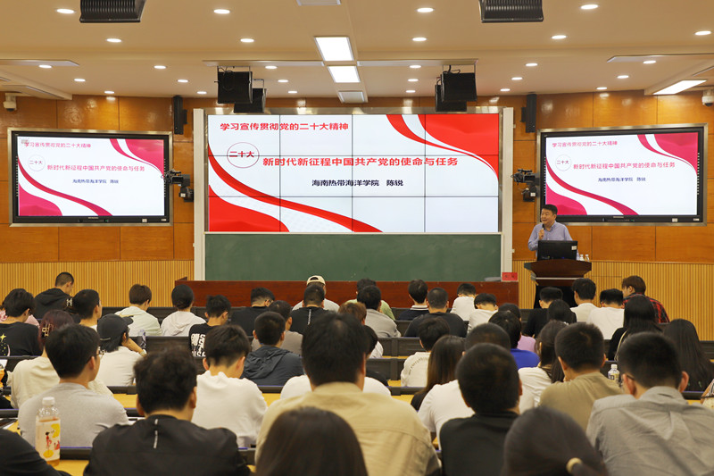 陈锐以《树理想、强本领、勇担当——深学笃行党的二十大精神》为题,分别从党的二十大召开、新时代新征程中国共产党的使命、海南在中国式现代化建设中的任务、beat365平台官方网站在自贸港建设中的担当四个方面进行讲授。