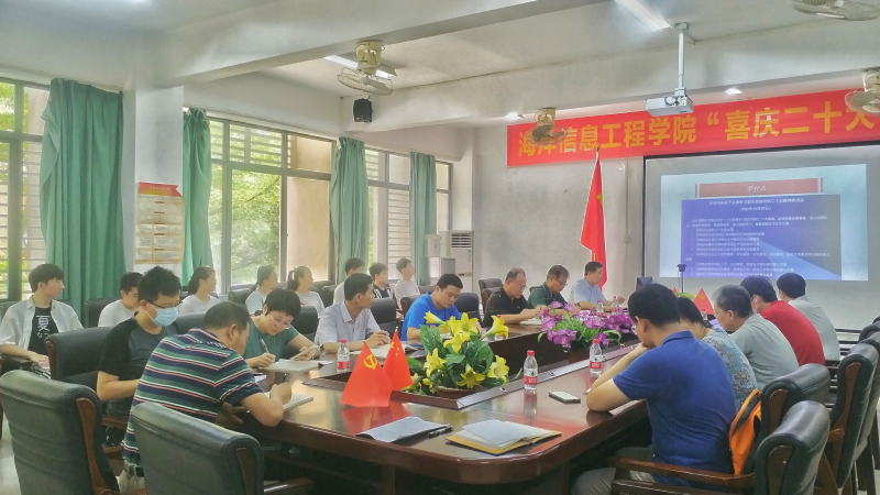 返回首页您当前位置: 首页->新闻资讯->中国共产党第二十次全国代表大会4月19日,海洋信息工程学院邀请学校宣讲团成员马克思主义学院党总支书记邢启敏作题为《全面推进中华民族伟大复兴的政治宣言和行动纲领--深入学习贯彻党的二十大精神》宣讲辅导报告。海洋信息工程学院副院长王连明、孙志雄,副书记曾令伟参加报告会,学院党总支书记郑泽龙主持。