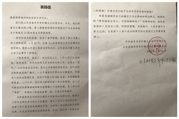 近日,beat365水产与生命学院收到来自山东省曲阜市吴村镇丛庄村委员会发来的一封表扬信。信中对来自2017级水产养殖专业马祥亮同学在家乡疫情防控工作中的突出表现给予高度赞扬。