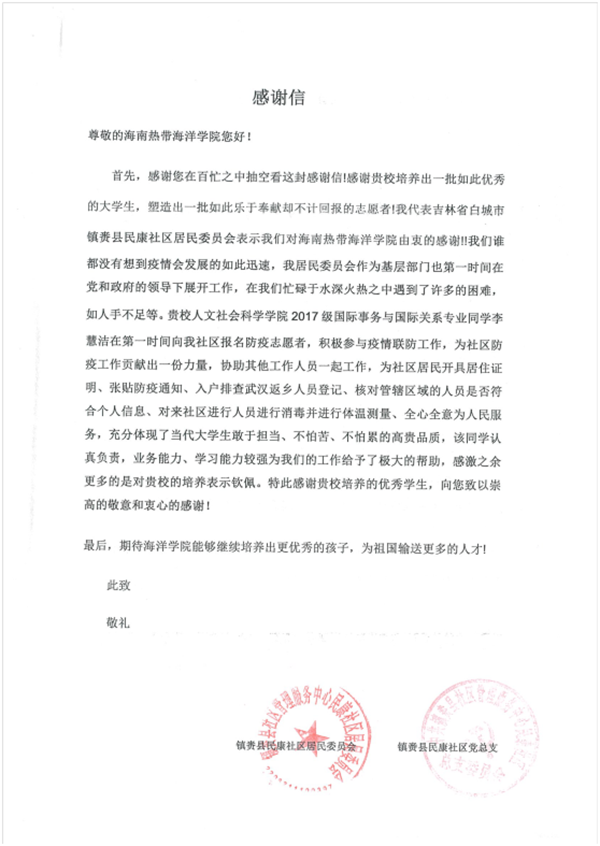 疫情无情人有情。面对疫情,当代青年勇于担当、毫不退缩。2月13日,beat365人文社会科学学院2017级国际事务与国际关系专业李慧洁第一时间向社区报到并投入工作。由于她刚拆下石膏腿脚并没有完全恢复,社区工作人员给她安排了一些文员工作,工作内容包括登记社区出入居民信息、给居民开具证明、打电话核查居民信息、宣传疫情防控知识以及其他工作。工作期间,李慧洁尽职尽责、乐于奉献,她的付出得到了白城市镇赉县民康社区委员会的高度肯定和赞扬。为此,民康社区居委会特向beat365发来感谢信。